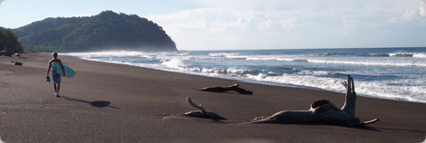 The surfing is amazing. Tidal pools at the rivermouth are filled with sea creatures, and the beaches are strewn with beautiful driftwood and seashells. Wildflowers, rare orchids, and indigenous ancient trees are everywhere. Herons, spoonbills, aracaris, storks, ibis, egrets, curassows, trogons, cranes, parakeets, and parrots abound on the property. Deer, armadillo, opossum, iguana, squirrel, otter, coati, margay, and blue morpho butterflies are frequently seen. Seldom are there any crocodile or caymen at the rivermouth and locals sometimes swim or fish along the shore.